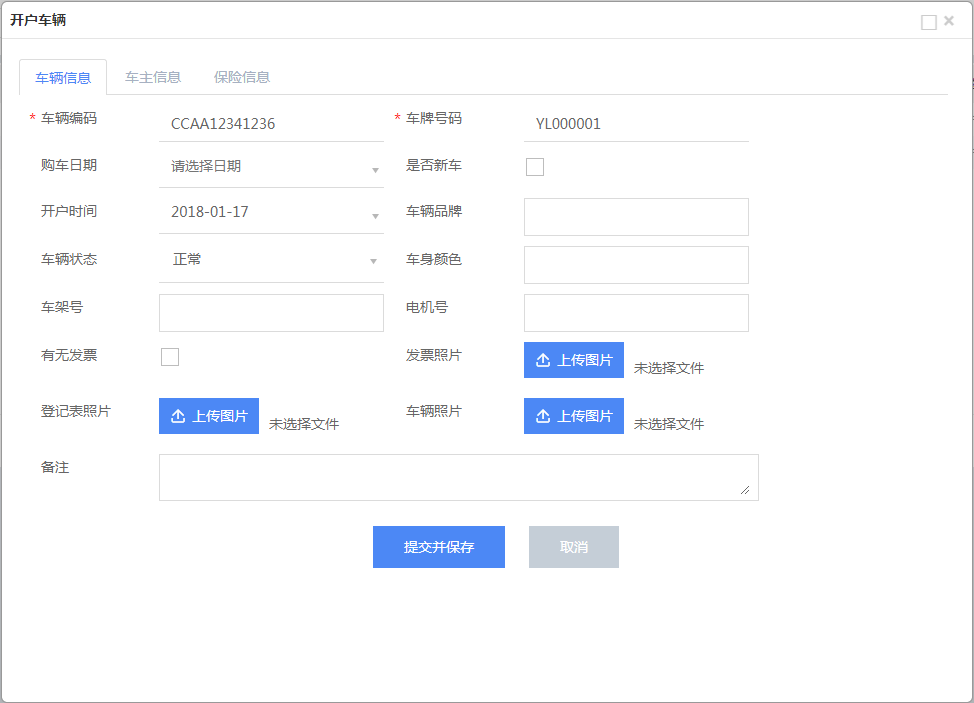 開(kāi)戶員工點(diǎn)擊開(kāi)戶按鈕,可對(duì)該車(chē)牌標(biāo)簽進(jìn)行開(kāi)戶操作,按照表單內(nèi)容填寫(xiě)正確的車(chē)輛信息、車(chē)主信息、保險(xiǎn)信息,點(diǎn)擊保存后開(kāi)戶成功。