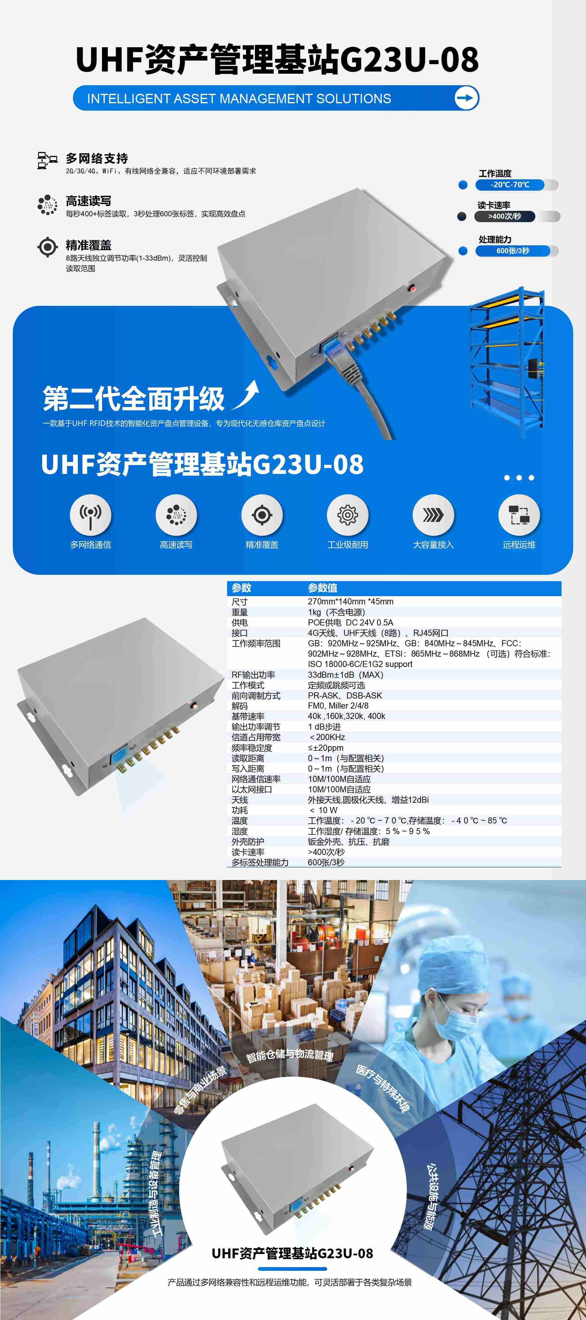 該基站采用工業(yè)級(jí)設(shè)計(jì),采用鈑金外殼防護(hù),抗壓抗磨損。外接8路射頻天線,一臺(tái)基站可覆蓋多個(gè)貨架減少主機(jī)用量,設(shè)備每秒可讀取400個(gè)以上標(biāo)簽數(shù)據(jù),滿足大規(guī)模資產(chǎn)盤(pán)點(diǎn)的精準(zhǔn)管理需求。設(shè)備支持4G/有線網(wǎng)絡(luò)多種通信方式,數(shù)據(jù)可實(shí)時(shí)上傳至管理平臺(tái),幫助企業(yè)實(shí)時(shí)了解資產(chǎn)狀態(tài),實(shí)現(xiàn)資產(chǎn)溯源、精確盤(pán)點(diǎn)和定位管理。