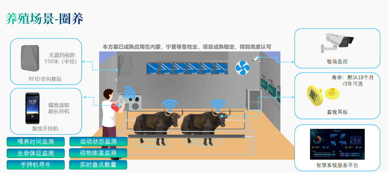 應(yīng)用場景:使用智能耳標(biāo)等,與牛只結(jié)合做到溯源唯一性,隨時可以查詢牛只的實(shí)時狀態(tài),將原來的牛只資產(chǎn)盤點(diǎn)系統(tǒng)從靜態(tài)方式升級為實(shí)時動態(tài)盤點(diǎn)。通過耳標(biāo)可實(shí)時采集牛只體溫、運(yùn)動數(shù)據(jù),進(jìn)行分析發(fā)情、疫情、生病等狀態(tài)分析,風(fēng)險預(yù)測。